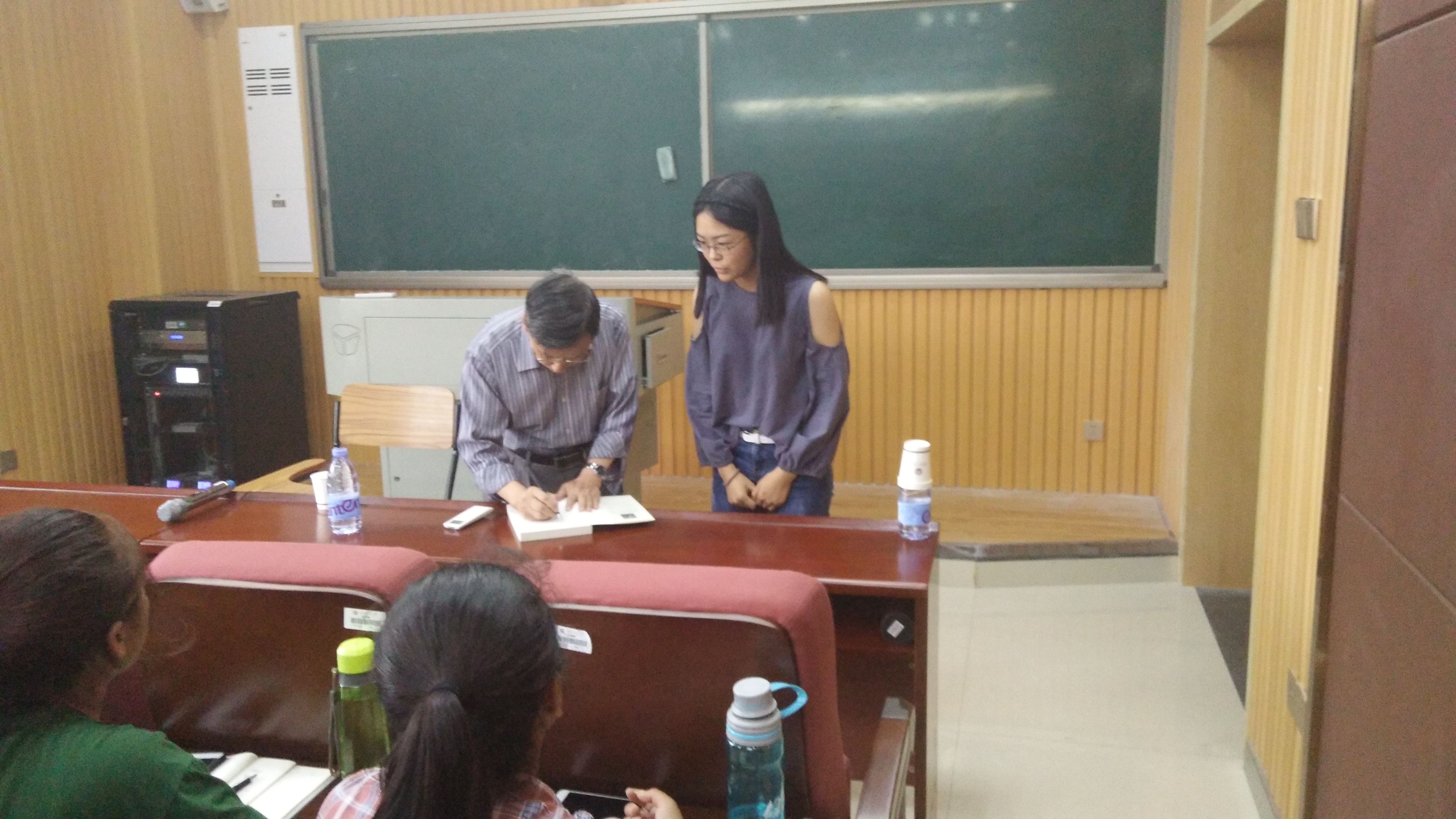 讲座伊始,林可济教授向大家简单介绍大学生活的变化,希望同学们改变学习态度、改变学习方法,尽快融入大学生活。林教授由大学学习方法引出读书与思考的重要性,他认为读书重要性有三:首先是担负起传承文化的使命。林教授引用哲学中“轴心时代”的概念勉励大家持续思考、持续努力。其次是通过读书来提升个人的精神世界,培养高尚情操。第三,读书的过程是一个思考的过程,我们应当通过思考理解书的内容达到融会贯通,以此来了解大千世界各种具体知识并掌握各种规律来改造世界。最后林教授还结合自身多年经验及体会与在场同学进行互动交流。他细心解答我院新生李诗琪关于专业模糊的入门问题并赠送了自己的作品《皓首沉思录》。此外,许多同学也积极提问、交流解惑,讲座现场气氛异常活跃,同学们受益良多。最后,金导巧妙运用自来水的输入、加工和输出的例子,提出自己对读书、思考和表达的心得,赢得在场同学热烈响应。至此,林教授的讲座落下帷幕。