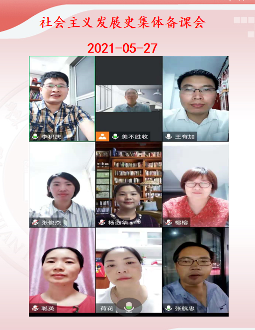 5月27日晚,马克思主义中国化教研部在腾讯会议云端举行2020-2021学年下学期第六次集体备课会。集体备课会上,教研部围绕“全国高校大学生同上一门思政大课——社会主义发展史”的主旨内容融入课堂理论与实践教学进行讨论。与会老师围绕空想社会主义产生和发展、马克思恩格斯创立科学社会主义理论体系、列宁领导十月革命胜利并实践社会主义、苏联模式逐步形成、新中国成立后我们党对社会主义的探索和实践、我们党作出进行改革开放的历史性决策、开创和发展中国特色社会主义六个阶段进行学理讨论,引导和帮助学生进一步坚定中国特色社会主义的道路自信、理论自信、制度自信和文化自信。今后,概论教研室将继续将“四史”学习有效融合进思政课堂,引导将理论学习和社会实践有机结合起来,关注时政热点,胸怀两个大局,不断提升思政课程实效。