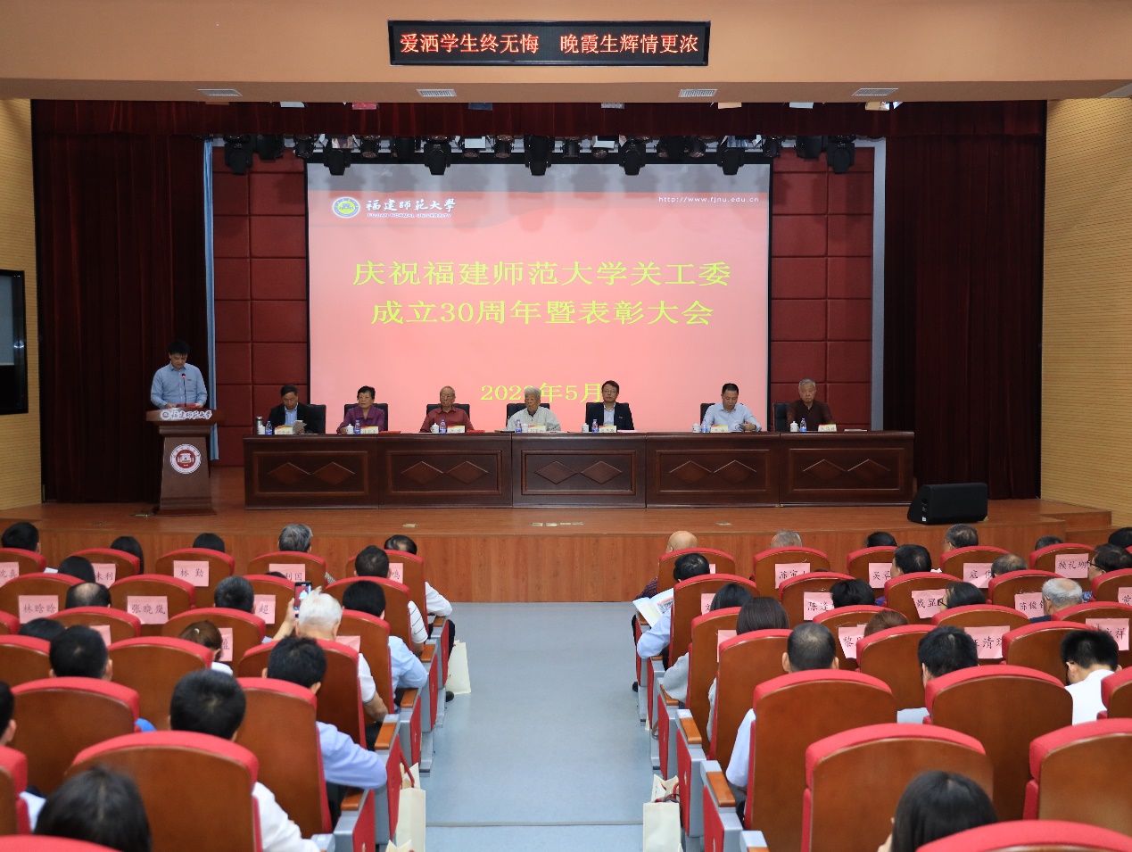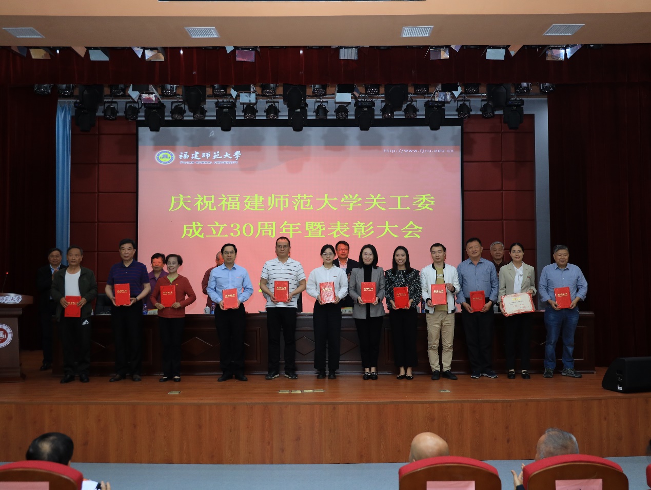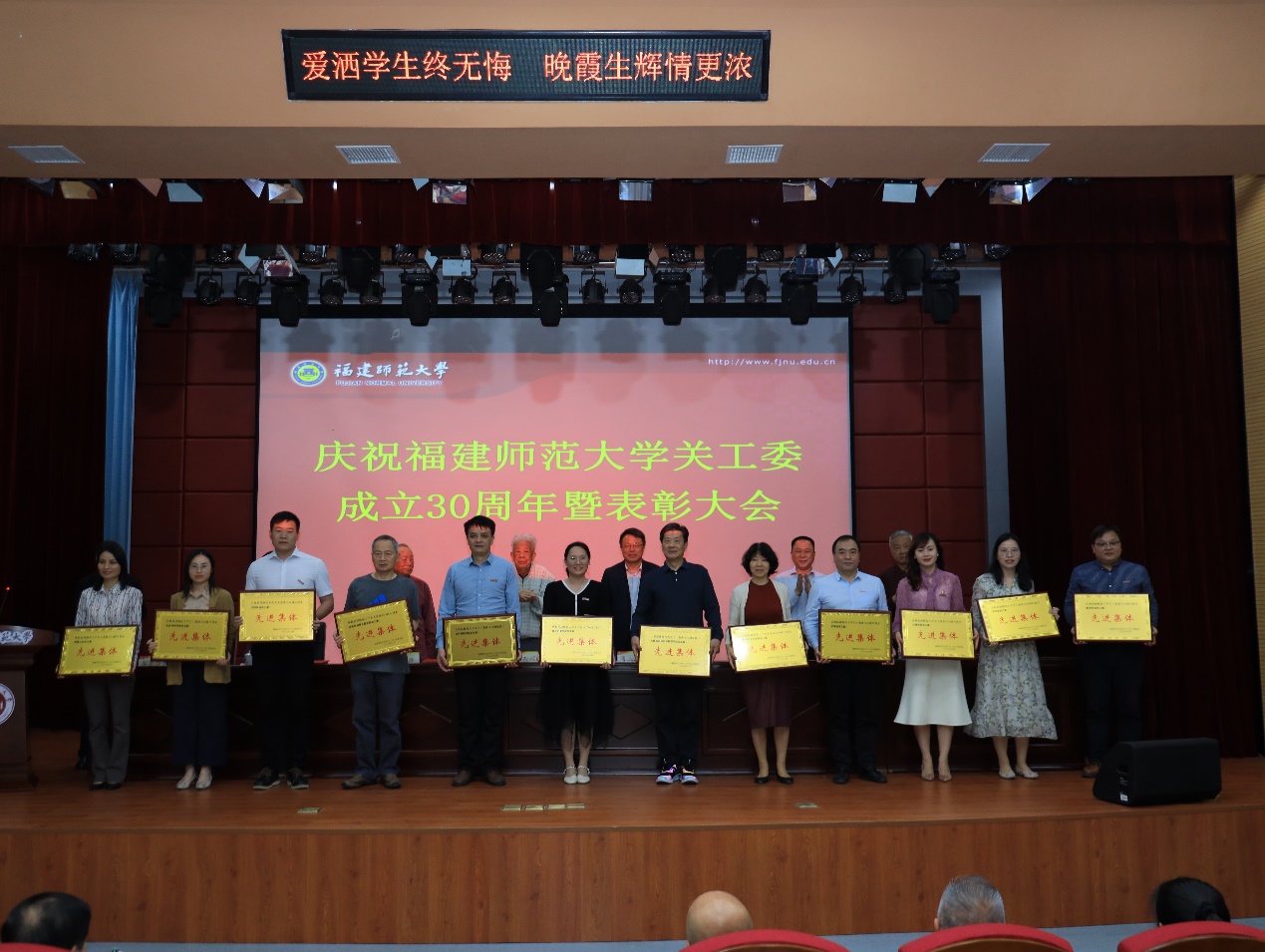 为庆祝福建师范大学关工委成立30周年,我校于5月10日在仓山校区科学会堂召开表彰大会。省教育系统关工委执行主任郭荣辉、副秘书长郑立中,校领导潘玉腾、涂荣,校关工委主任、副主任,有关职能部门负责同志,各学院、附中、附小党委主要负责同志和关工委第一主任、主任、秘书,以及获奖集体和个人代表、学生代表参加,校关工委副主任、秘书长郭警修主持大会。