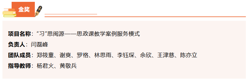 近日,福建省教育厅公布福建省大学生创新大赛(2025)获奖名单,我院“‘习’思闽源——思政课教学案例服务模式”项目荣获“青年红色筑梦之旅”赛道金奖。