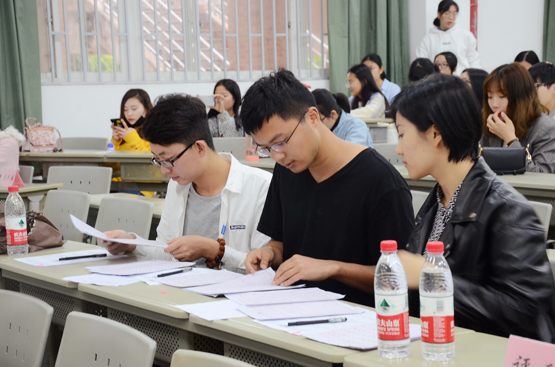 4月15日下午14:00,我院在立诚1-105教室举办“第七届师范生‘三笔字’大赛”,本次比赛有幸邀请到美术学院书法专业研究生陈宇、杨诗琳、王鑫同学担任评委。