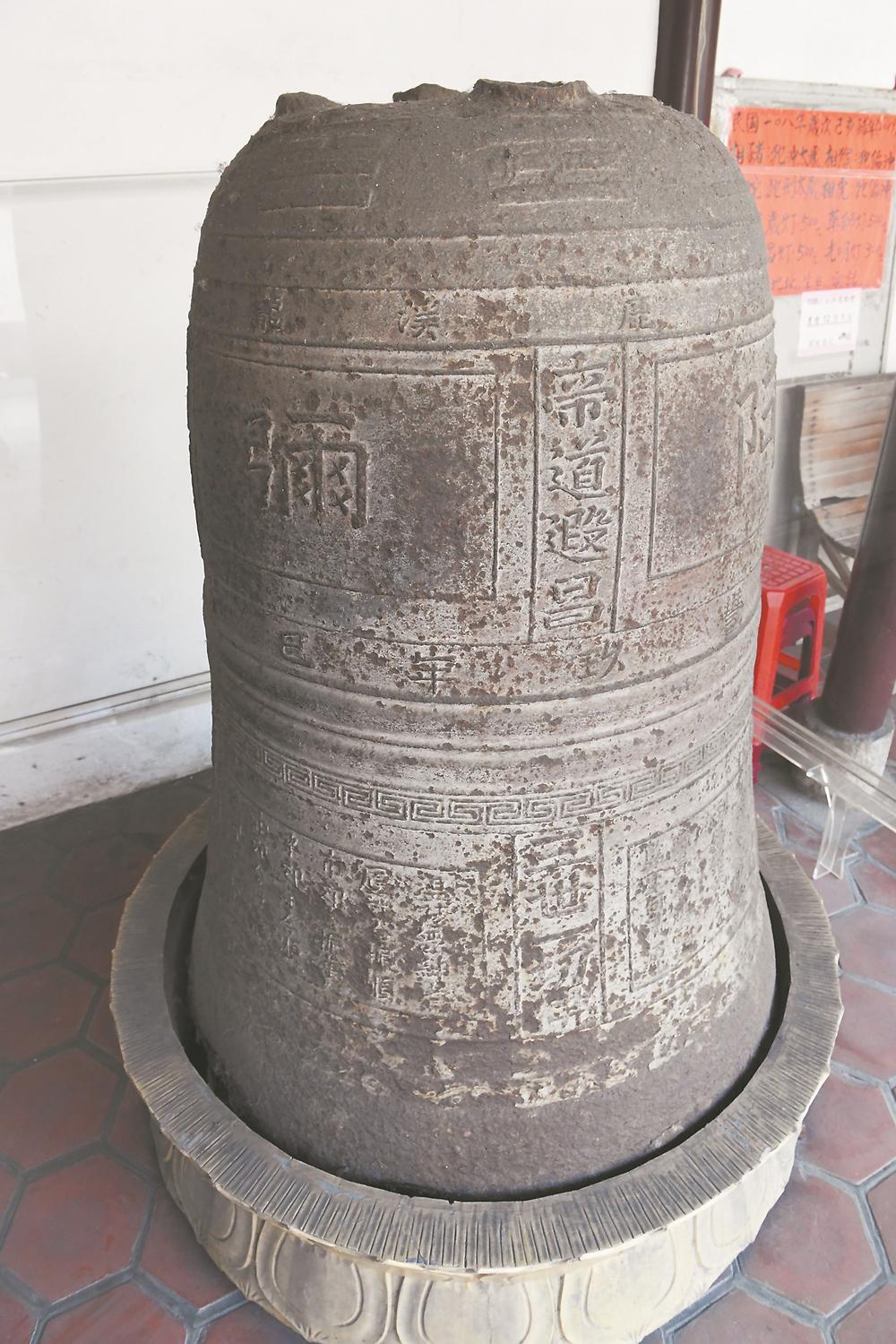 道光二十八年(1848年),台湾中部发生了强烈地震,鹿港龙山寺受损严重。咸丰二年(1852年),鹿港士绅及郊商着手重修龙山寺,至咸丰八年(1858年)完成。咸丰九年(1859年),派人到浙江宁波铸造铜钟,运回安置放在厢廊。该钟的承重钟钮虽已毁损,钟身锈迹斑斑,但其表面的铭文仍可辨识,其中蕴含着重要的历史信息。