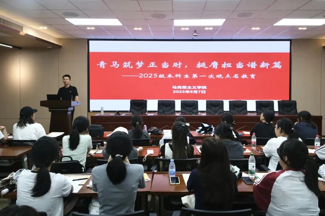 9月7日,我院全体2025级本科生在人文楼113学术报告厅开展晚点名活动,活动由本科生辅导员陈为强主持。会议围绕学院概况、安全规范、宿舍管理和成长寄语等方面展开,介绍了学院发展、科研成就与人才培养方向,强调遵守校纪校规、加强防范诈骗意识的重要性。陈为强以辅导员、学长和兄长三重身份,勉励新生树立底线思维、永葆进取之心、常怀平常之心,尽快适应大学生活、打好专业基础、全面提升自我。现场反响热烈,为新生融入大学奠定了坚实基础。学院将持续创新晚点名教育形式,夯实立德树人阵地。