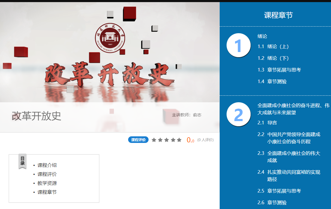 该门课程依托我校教学云平台,面向我校2021级本科生,采取“自主制作慕课+学习通APP”线上授课模式,共设置15个教学章节,每个章节既有教研部教师的专题讲授,也有课外相关内容的拓展、课后思考和章节测验。通过本门课程的线上学习,有助于帮助学生深入了解我国改革开放以来的历史进程,树立正确的大历史观,胸怀中华民族伟大复兴的战略全局和百年未有之大变局。
