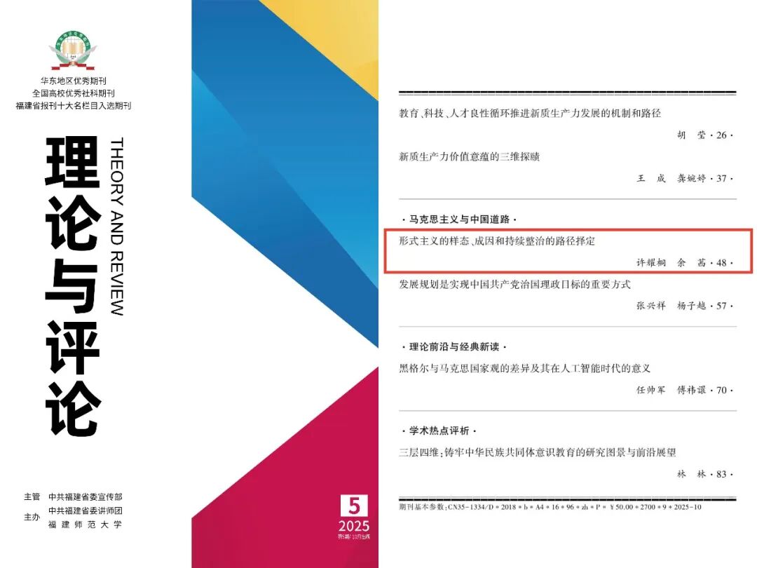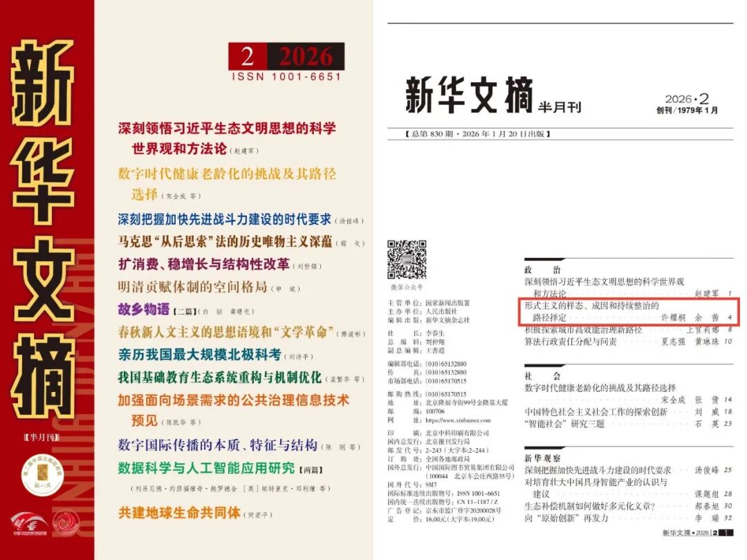 《理论与评论》2025年第5期刊发的《形式主义的样态、成因和持续整治的路径择定》一文被《新华文摘》(2026年第2期)全文转载。此前,该文还被人大复印报刊资料(《中国共产党》2026年第1期)全文转载。该文作者系福建师范大学马克思主义学院特聘教授、中共中央党校(国家行政学院)一级教授许耀桐,中共北京市委党校(北京行政学院)副研究员余茜。该学术论文获《新华文摘》和人大复印报刊资料全文转载,充分体现了《理论与评论》内容质量与学术影响力的持续提升。现将文章摘要推介如下: