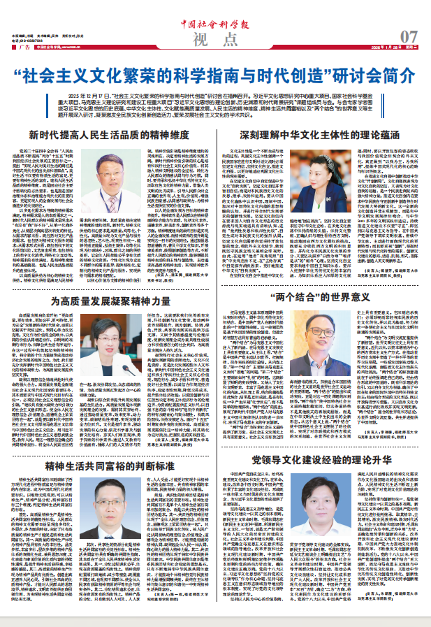 2026年1月28日,《中国社会科学报》以专版形式,图文并茂报道了习近平文化思想研究中心重大项目“习近平文化思想的理论创新、历史渊源和时代背景研究”举办的“社会主义文化繁荣的科学指南与时代创造”研讨会情况,并刊发了课题组潘玉腾教授、傅慧芳教授、黄雯教授、李瑞德教授、朱新屋教授、陈一收教授的发言内容。