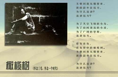 很多时候,我也会疑惑,撒哈拉到底有什么吸引着三毛,让她不顾一切,只身前往。在三毛填词的歌曲《橄榄树》中,三毛说:流浪,是“为了天空飞翔的小鸟,为了山间清流的小溪,为了宽阔的草原……为了梦中的橄榄树”。三毛也许喜欢的并非流浪本身,而是梦中的橄榄树,而橄榄树又是什么呢?是那颗向往自由的心,追逐自由的脚步;还是那如幻似镜,虚无缥缈的梦。犹记读到《哑奴》那一篇时,这个细节——“哑奴呆呆的望了会天空,比比自己的肤色,叹了一口气,过了一会儿,他又笑了,他对我们指指他的心,又指指小鸟,又做了飞翔的动作”,这个细节让我久久不能释怀,平实的语言,却道尽了对自由的向往,而这个向往自由的人,是哑奴,还是三毛?人总要有一个梦想,有一个理由去坚强,在这贫瘠的土地上,承载的是三毛不甘于平凡的梦,所以,她坚强如一棵永远屹立不倒的树,站成永恒,从不寻找,从不依靠,或许,正如她所言,飞蛾扑火时,一定是极幸福快乐的,所以她从不害怕黑夜,从不惧怕风沙。