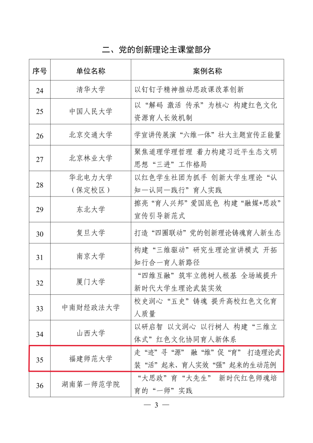 近日,教育部发布首批新时代学校思想政治教育典型案例名单,我院申报的《“走“迹”寻“源” 融“维”促“育”——福建师范大学打造理论武装“活”起来、育人实效“强”起来的生动范例》案例成功入选“党的创新理论主课堂”部分。
