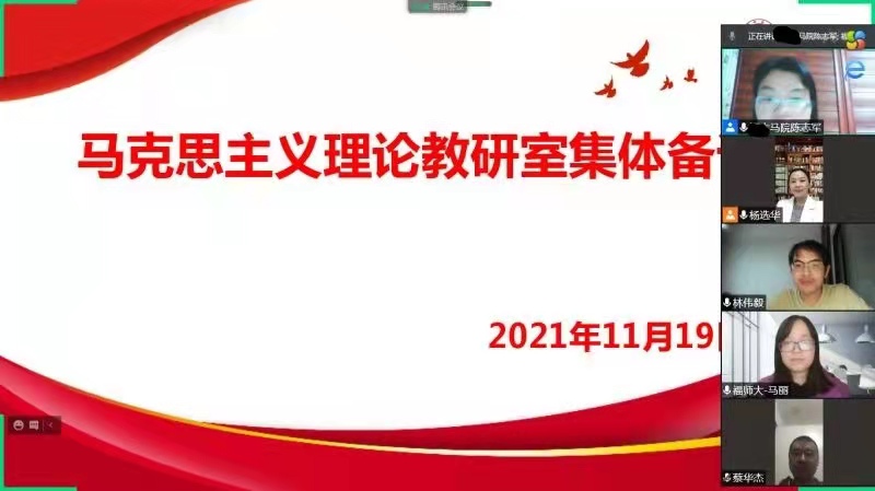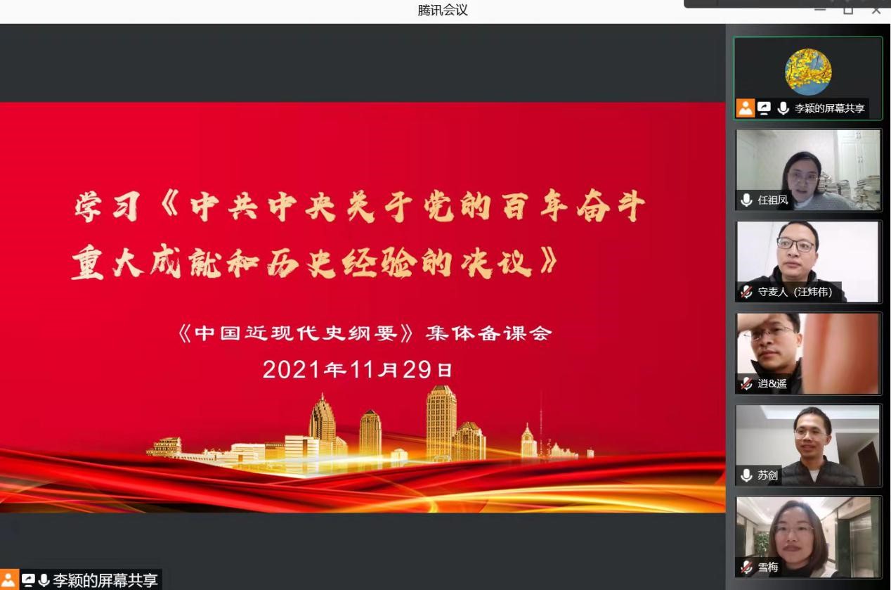 1119日,我院马克思主义理论教研部进行线上集体备课会。专业负责人围绕“从党的百年奋斗中看清楚过去我们为什么能够成功,弄明白未来我们怎样才能继续成功”这一逻辑主线,全面阐释了党百年奋斗的成就、历史意义和宝贵经验。围绕“如何将十九届六中全会精神融入思政课教学”这一主题,与会教师纷纷结合本学期所讲授的课程特点,阐释了全会精神融入思政课的内容、方法与路径。要用纵向、横向比较的方法讲好党的百年奋斗历史成就;要把全会精神融入教学,做好学生思想和价值的引领;要引导学生以史为鉴,领会党百年奋斗的历史经验;要在集体备课会的基础上精心开展教学研究,切实找准切入点、连接点,把全会精神转化为最鲜活的教学资源。