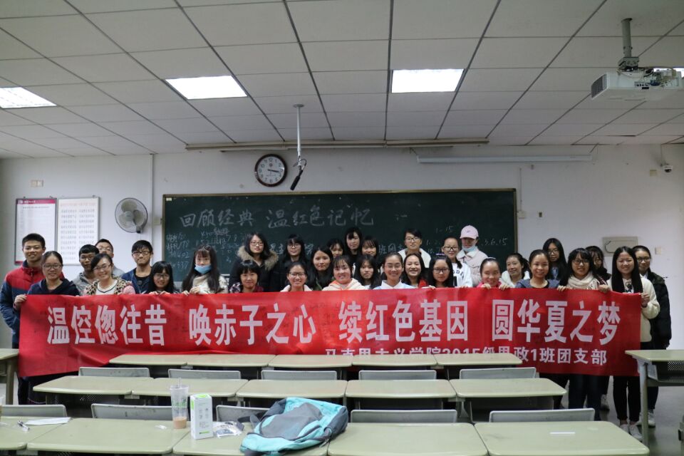 正值长征胜利八十周年,为响应习近平总书记“红色基因,代代相传”的号召,2015级思政1班团支部于11月30日在笃行1-301开展了以“回顾经典,温红色记忆”为主题的团日活动。本次活动由团支书游陈婷同学主持,本支部全体成员参与其中。