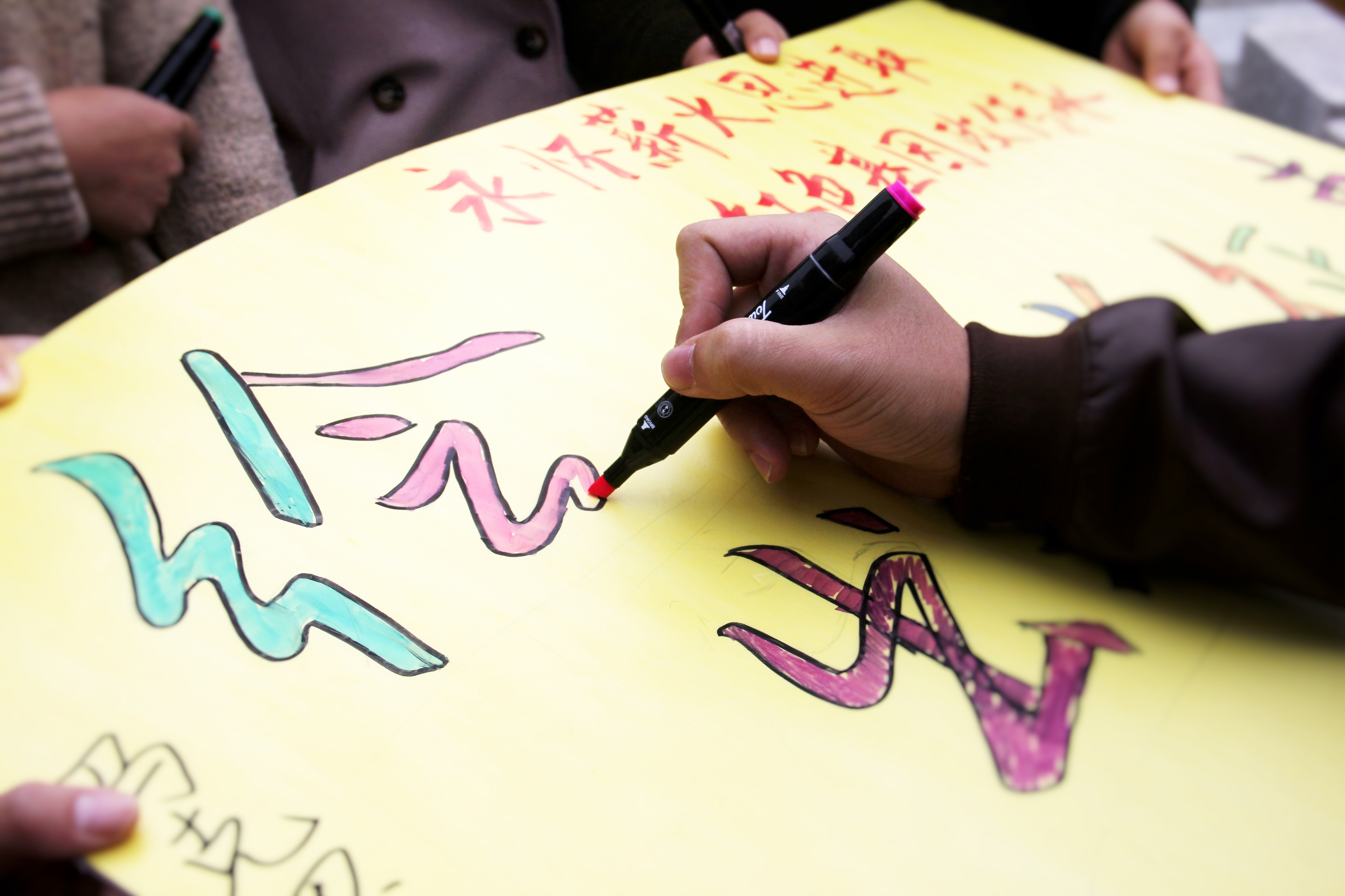在线下活动中,支部成员分成四个小组,各组组员在KT版上以空心字的方式设计指定文字,在学校内指定地点邀请老师和同学一起涂色填充并合影留念。涂色填充活动受到来自不同学院同学的欢迎,大家纷纷主动上前帮忙涂色,其中还有保安叔叔用心地为我们填满画板。