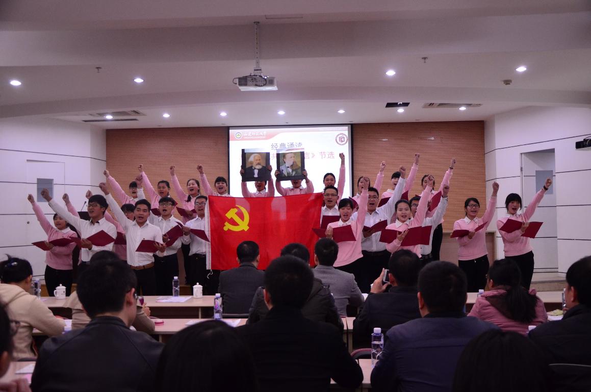 本次活动由学院团委书记涂莹老师主持。在场师生首先通过短片《铭记一二•九》回顾了“一二•九”运动的光辉历史。接下来的经典诵读环节中,马克思主义学院学生代表怀着满腔热血,为大家带来了精彩的《共产党宣言》节选诵读,赢得了全场的热烈掌声。